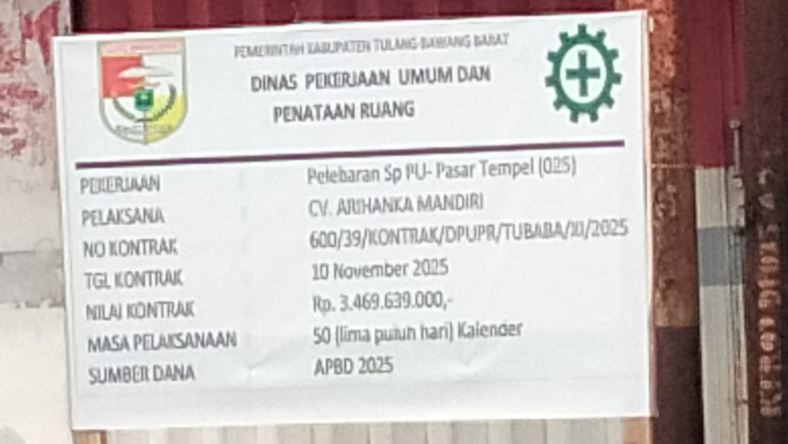 Pasalnya, Berdasarkan Papan nama Informasi kegiatan menjelaskan bahwa Proyek Pelebaran Jalan Sp PU- Pasar Tempel (025) dimenangkan oleh CV ARIHANKA Mandiri dengan no kontrak 600/39/KONTRAK/DPUPR/TUBABA/10/2025.